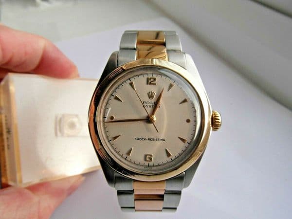 It measures 36mm in diametre and has the rare semi bubble back. The watch is fitted with an after market oyster bracelet strap.
